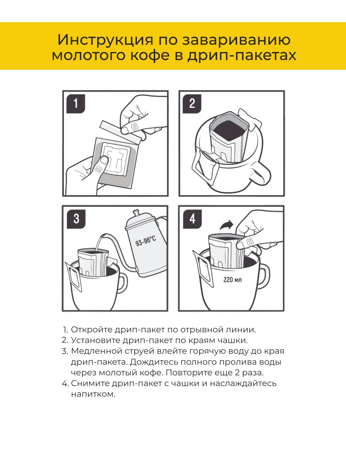 Формат дрип-кофе позволяет легко заварить фильтр-кофе без дополнительного оборудования — стабильно и удобно, где бы вы ни находились.