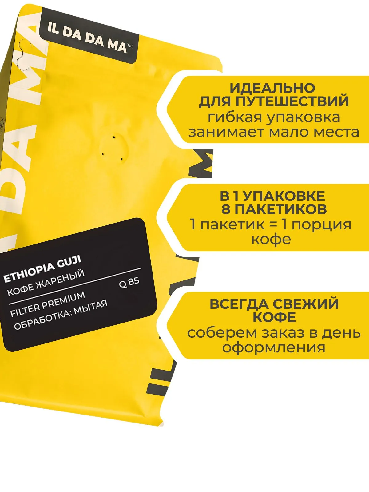 Дрип-кофе из региона Гуджи в Эфиопии — это яркая и чистая specialty-арабика с выразительным фруктово-цитрусовым профилем и элегантной кислотностью.