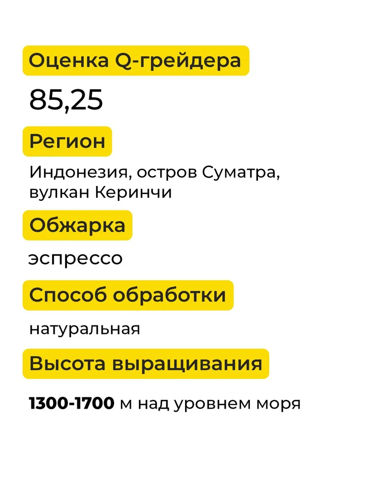 Specialty-арабика из региона Керинчи на острове Суматра, обжаренная под эспрессо. Кофе с насыщенным, плотным телом, выраженной сладостью и пряно-фруктовым характером.
