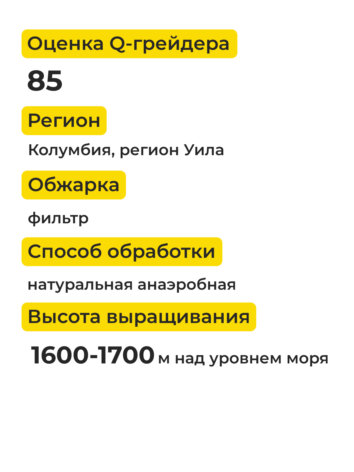 Этот лот - сорта Variedad Colombia - один из его экспериментов. Ферментация начинается в закрытых мешках под навесом в течение 12 дней. После этого кофе проходит первый этап сушки в механической сушилке и потом отправляется на стабилизацию в закрытые помещения. Финальный этап сушки в ягоде проходит на солнце на африканских кроватях 8 дней.